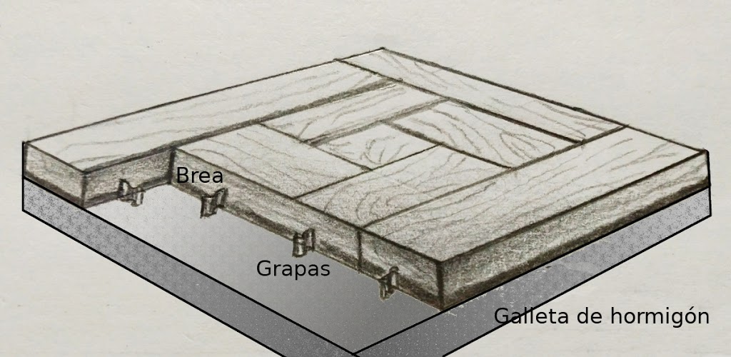 Se hacía una loseta de mortero de cemento en un molde. Se dejaban secar y se cubrían con una brea adhesiva, sobre la que se colocaba la loseta de parquet unida por grapas.