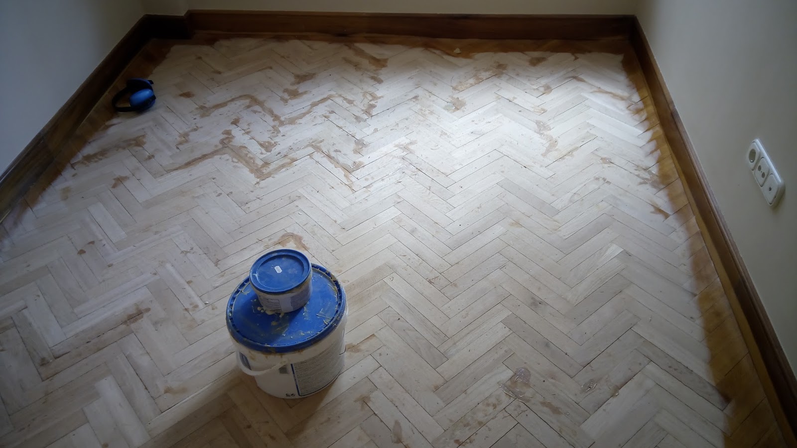 Tras lijar procedemos a pegar todas las tablas sueltas. Había bastantes, sobre todo por la rotura de una fina pasta niveladora sobre terrazo. Usamos una cola de poliuretano que salva mayores alturas para no rellenar con un material quebradizo.
